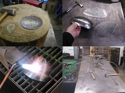 The body was made from flat sheet metal that Ken hammered into shape. The legs are tapering, solid round steel.